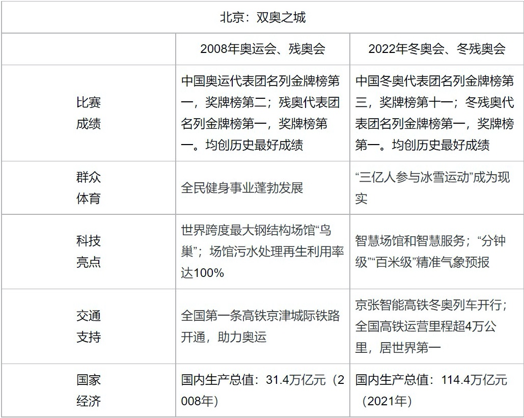 材料围绕“北京:双奥之城”组织信息,从两次奥运比赛成绩到两次奥运举办时的综合国力,多方面呈现体育精神、社会进步、科技创新和国家发展。北京两次举办奥运会是中国人民爱国热情的激扬展示,是新时代建设伟大成就的体现。试题以表格和数据的形式,直观呈现我国综合国力的跨越式发展,激发学生的爱国热情,引导学生体会奥运精神的深刻内涵,体会奥运会成功举办背后的国家力量和制度优势,将爱国和爱党、爱社会主义高度统一。